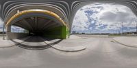A modern architectural marvel in Toronto, Canada. The large arched structure is covered in concrete, with an interior roof design. The yellow lines on the road lead to the urban plaza, providing a vibrant city life experience.