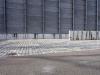 An architectural marvel in Berlin, Germany. The concrete facade of the building creates a striking pattern against the clear European sky. The line of trees along the open space adds a touch of nature to this urban landscape.
