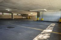 a parking garage with yellow painted lines and windows on the inside of the area, with grey walls and a large concrete ceiling