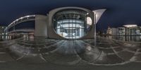 the 360 panoramic photo shows the circular entrance to an outside building next to water