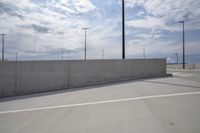 A view of a concrete street with asphalt road surface, lined with street lights and trees. The grey clouds overhead cast a shadow on the architecture of the parking garage and entry driveway. A typical day on this thoroughfare.