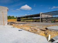 This is an image of an open-air construction site with a man walking towards a concrete building. The clear sky above contrasts with the dirt and gravel surface of the site. The construction represents progress and development, with the man on his cellphone symbolizing communication and productivity. This photo captures a typical workday at a construction site.