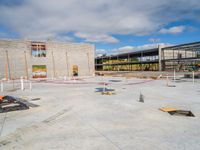 Construction site with concrete surfaces and equipment under a cloudy sky. A busy day at the site as workers continue building the infrastructure.