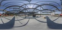 A construction site on a sunny day, with concrete surfaces and open spaces. A straight road leads to the building, casting hard shadows. The profile of the building reflects in a circular object.