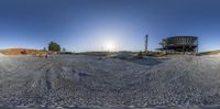 A construction site in the USA with a clear sky and open space. A person walks on top of sand while a building and structure are visible in the background. The sun shines down, casting long shadows.