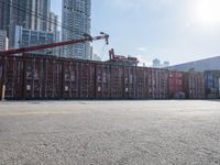 A construction worker stands near container boxes outside a building area in an urban environment. The cityscape of Hong Kong can be seen in the background, with clear skies and a bustling harbor. This photo captures the vibrant energy of this metropolitan area in Asia.