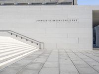 This is an image of a modern architecture building located in Berlin, Germany. The concrete facade of the building is showcased in the photo, with a line of stairs leading down to the entrance of the James Simon Gallery. The clear day allows for a perfect view of the urban design and structure of the building. The stairs and walkway are highlighted against the backdrop of the city, representing the bustling city life of Berlin. The sandstone walls of the building add a touch of architectural beauty to the modern business district. This photo captures the essence of urban Europe.