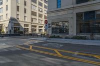 A corner street in Los Angeles, California, showcasing modern architectural design. Vibrant city life with urban shops and storefronts. The yellow arrows indicate a parking spot in the bustling art district.