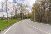 An empty country road in Ontario, Canada, winding through a lush forest. The road is flanked by tall trees and a green hedge, creating a serene and peaceful landscape. A perfect day for a drive in nature.