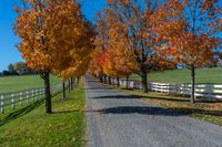 a country road with a wooden fence along side with white wooden fences and fall leaves all around