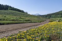 A lush green landscape in Crested Butte, Colorado. Clear skies and mountain landforms create a stunning backdrop. An off-road track meanders through the dense forest, offering recreational activities in this picturesque destination.