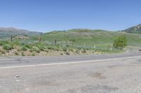 A road in Crested Butte, Colorado, winds through a picturesque landscape of mountains and wildflowers. Clear blue sky contrasts with the vibrant vegetation. Serene nature scene in the USA.