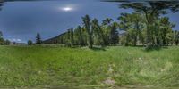 Panoramic view of a field in Crested Butte, Colorado, with lush green grass and tall trees under a cloudy sky. The natural environment showcases the diverse vegetation and evergreen forests of the highlands.