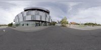 a distorted image shows the intersection of an empty parking lot and a curved building with many windows