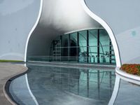 This stock photo features a magnificent curved building located in Taichung, Taiwan. The building stands tall amidst a cityscape, showcasing modern architecture and urban design. The surrounding area is adorned with beautiful water features, including a captivating reflection of the building and nearby plants. The vibrant city life of Taichung adds to the lively atmosphere captured in this image. This photo perfectly illustrates the unique blend of urban and natural elements in Taiwan's Republic of China.