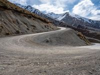 a dirt road winding in the mountains towards some snow - covered mountains and some brown rocks