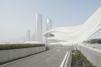 This stock photo showcases a beautiful view of a curved modern architecture building, located in a city street. The building stands out with its unique design. In the foreground, there is a neatly paved road with lush green grass in front of it. This urban cityscape represents the blend of nature and contemporary architecture. The curvaceous building reflects futuristic architecture, capturing the attention of passersby. The clear blue sky and the concrete surface add to the overall charm of the scene. It is an ideal image to illustrate urban life, modern architecture, and city facilities like museums, opera houses, and music halls.