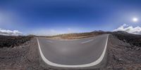 the curved roadway of a mountain road has a clear sky above it and a few clouds