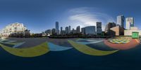 a fisheye lens view of the city with a curved painted parking area and a fountain