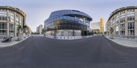 360 panning photo of a curved road and buildings with a large glass dome on it