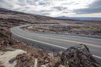 Curved Road Through Rocky Desert Hills with Mountain Backdrop
