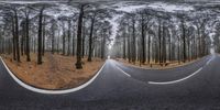 A curved road in Tenerife, Spain, surrounded by a northern hardwood forest. The road surface is wet, creating a motion blur effect. The gloomy and foggy atmosphere adds to the emotional landscape.