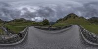 A fisheye view of a curving road in Austria, surrounded by majestic mountains. A small red umbrella sits atop the curb, adding a pop of color to the gloomy grey sky. An enchanting landscape in Europe.