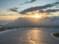 Curving asphalt road in Majorca, Balearic Islands, at dawn. Sun visible through the clouds on the horizon. Armco barrier along the road for safety. A picturesque European sunrise scene.
