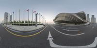 a view from outside of a very large building on the street corner, looking at a road with a building on top, a long curving curve and flags on it