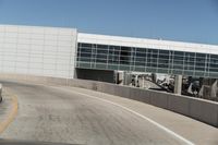 A view of a road in Dallas, Texas with a clear sky and a cityscape in the background. The road is made of asphalt and is lined with Armco barriers. The scene suggests a bright sunny day near an airport.