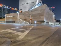 an intersection that is very lit up at night time, with cars moving in and out of the building
