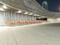 A night view of a modern architecture building in Dallas. The concrete and steel structure stands tall in the business district, illuminated by artificial lights. The road surface and paver lines add to the urban design.