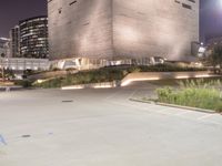 This is an image of a modern architecture building in the business district of Dallas. The cityscape features a clear sky and the buildings are illuminated by artificial lights at night. The road surface is made of asphalt and there are trees lining the open spaces. The image captures the urban design and metropolitan area of Dallas, with its mix of office buildings, museums, and other landmarks. The photo represents the bustling and vibrant atmosphere of the city at night.