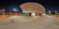 The iconic Dallas skyline at night, featuring a large circular building surrounded by city streets. The modern architecture and concrete street create a dynamic urban landscape, illuminated by artificial lights. A bustling metropolitan area with a vibrant nightlife.