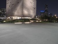 A packshot of Dallas cityscape at night, showcasing the modern architecture in the downtown area. Skyscrapers and office buildings illuminate the city, while the clear sky reflects on the water surface. The urban landscape is a mix of concrete streets and open spaces, with trees adding a touch of nature.