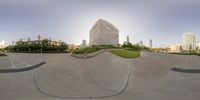 a 360 - view of an upside down skate boarder in the city park under a blue sky
