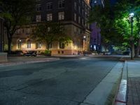 a city street at night with parking meters on either side and the road in the center