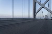 This is an image of a cable-stayed bridge at dawn. The bridge is a part of the city's infrastructure, connecting two thoroughfares. The road surface is made of asphalt and extends into the horizon. The motion blur of passing vehicles adds a sense of movement and activity. The clear blue sky and the break of day create a tranquil backdrop for the bridge. This photo showcases the architectural and engineering beauty of the cable-stayed bridge, capturing the parallel lines and the intricate details of its design.