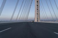 A breathtaking view of a suspension bridge at dawn. The bridge stretches across the clear blue sky, creating a straight path that leads into the horizon. The motion blur of passing vehicles adds a sense of energy and movement to the scene.