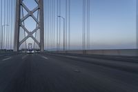 This stunning stock photo captures the break of day over an asphalt road, lined with infrastructure, leading towards the horizon. The motion blur adds a sense of movement to the scene. In the foreground, a magnificent cable-stayed bridge stands tall, connecting two points with its blue cables. The clear sky above creates a picturesque backdrop for this architectural marvel. The road surface glistens in the early morning light, inviting the viewer on a journey. With its combination of natural beauty and man-made structures, this image represents the perfect blend of nature and civilization.
