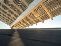 the skateboarder is riding under the bridge next to the beach by the water