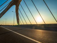 a view of the sun setting over the bridge from the bike path with it's headlights shining on a sunny day