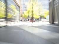 This image captures the bustling cityscape of Berlin, Germany. The photograph is taken from a high vantage point, showing the modern architecture and urban design of the city. The road is paved with cobblestones and asphalt, lined with trees and surrounded by office buildings and shops. The sunlight glimmers on the glass surfaces of the buildings, creating a stunning visual effect. The vibrant yellow lines on the road add a pop of color to the scene. This snapshot of Berlin showcases its status as a major European city and a popular tourist destination.