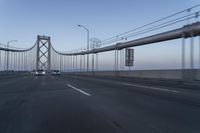 This is an image of a bridge taken at dawn from the perspective of a car on the road. The photo captures the view through the car's windshield, showing the asphalt road and blurred lines stretching ahead. The bridge is a suspended cable-stayed bridge, a remarkable piece of infrastructure that spans the horizon. The sunrise provides a stunning backdrop, with clear skies and the break of day casting a warm glow over the scene. This photo represents the seamless connection between road and bridge, symbolizing the beginning of a journey.