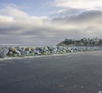a parking lot that has rocks by the ocean on it and trees in the background