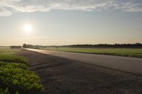 A rural landscape in Canada, with lush fields stretching to the horizon. The sun sets in the distance, casting a warm light on the empty road. Contrails streak across the sky, adding a touch of atmosphere to the scene.