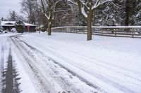 This image captures a gloomy winter morning in Toronto, Canada. The snow-covered road winds its way through a residential area, lined with trees on either side. The grey sky adds to the gloominess of the scene. The asphalt road surface is covered in snow, creating a beautiful and serene landscape. A wooden fence borders the road, adding a touch of rustic charm. This photo represents the peacefulness and beauty of a snowy winter day in a rural area of Ontario.