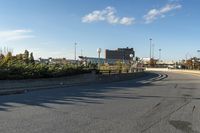 This is an image of an empty street in a residential area of Ottawa, Canada during dawn. The road is made of asphalt and is flanked by trees and bushes. In the distance, the city's skyline can be seen against the horizon. The road surface is illuminated by street lights, casting shadows on the pavement. This suburban landscape features land lots and office buildings, creating a business district. The image captures the peacefulness and quietness of the break of day in a bustling suburb of Ottawa.