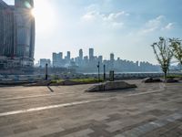 Chongqing at dawn, the sun peeks over a dynamic cityscape. Roads and rivers interlace this sprawling megacity as city life stirs to life, creating a picturesque urban scene with sunshine reflecting on the water.