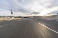 A stunning view of a city at dawn, with classic architecture and straight roads leading to a bridge. The sun is visible, casting a beautiful sunshine over the urban landscape.
